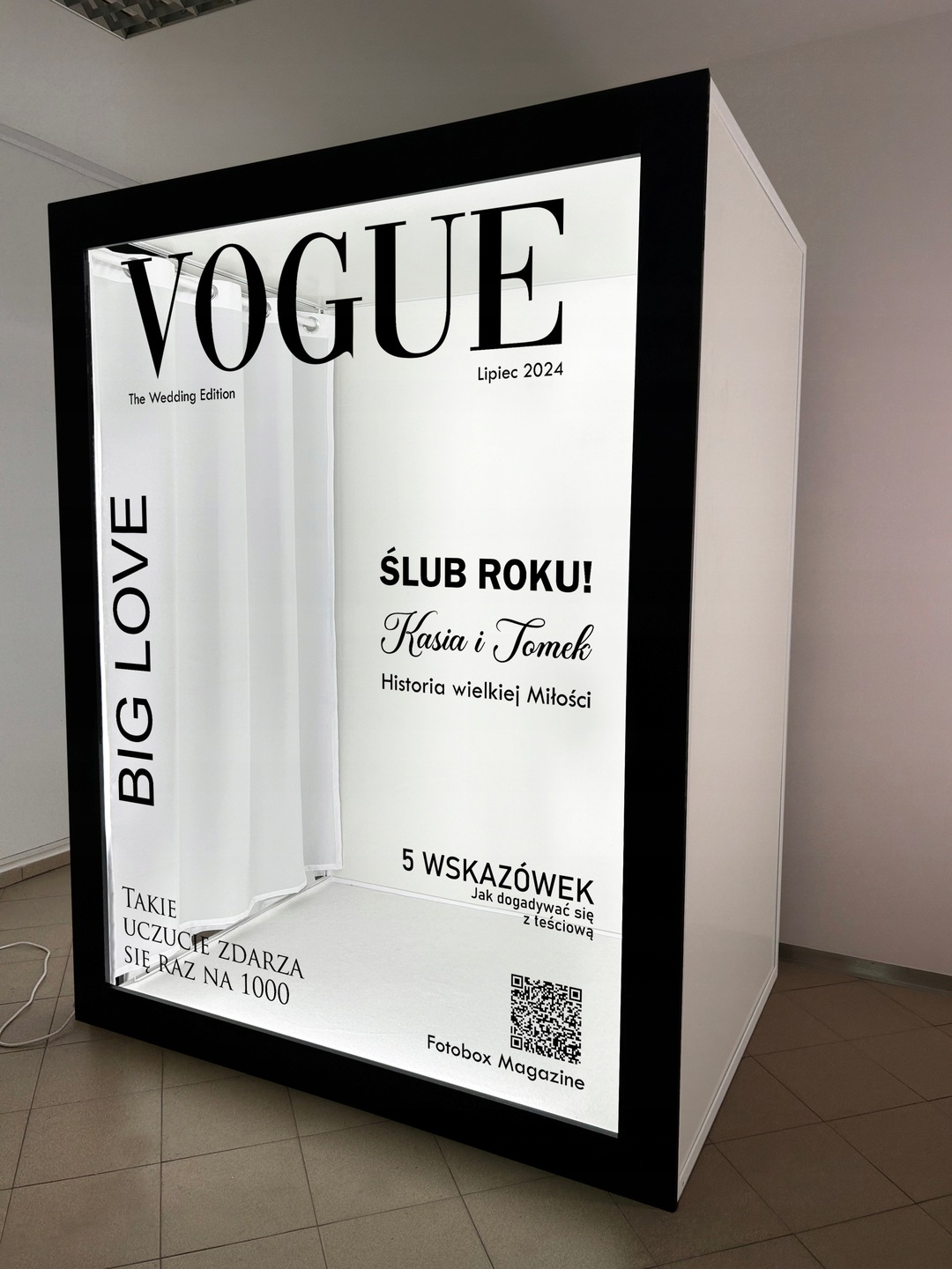 A stylish LED-lit Vogue display featuring decorative flowers and customisable branding, perfect for bold photo moments at any event.